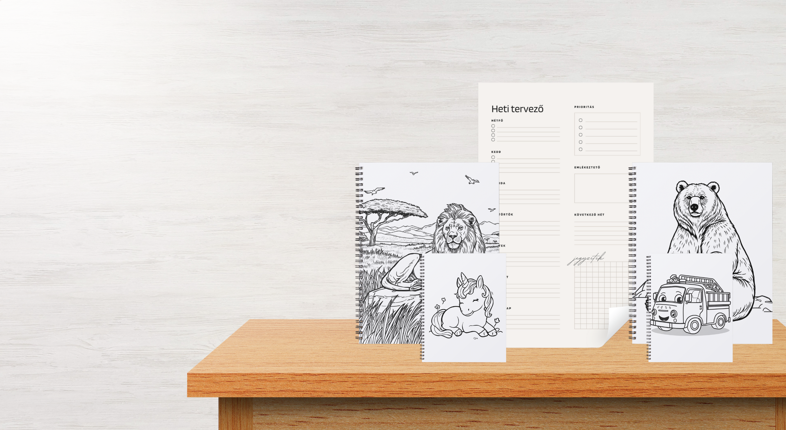 - Terméktől függően: nagy felbontású JPG (300 DPI), nyomtatásra kész PDF, több méretben (A4, A5, A6,)