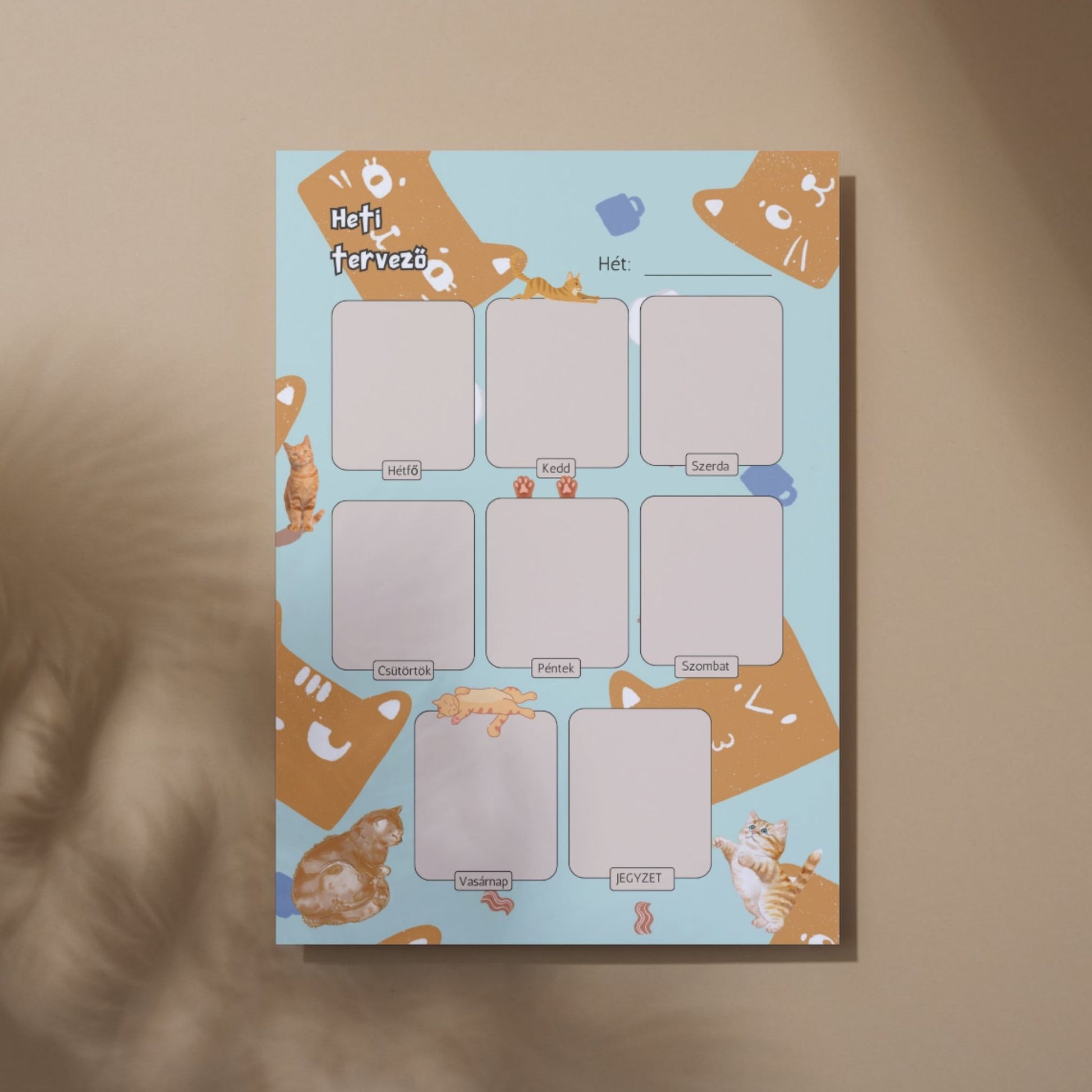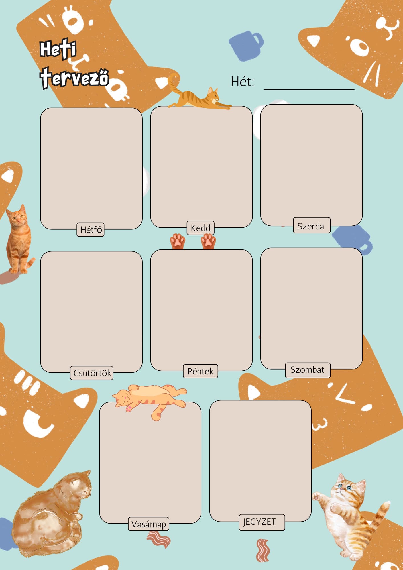 Ez a heti tervező tökéletes diákoknak, felnőtteknek, elfoglalt szülőknek vagy bárkinek, aki szeretne rendszert vinni a mindennapjaiba egy kis cica-varázzsal.